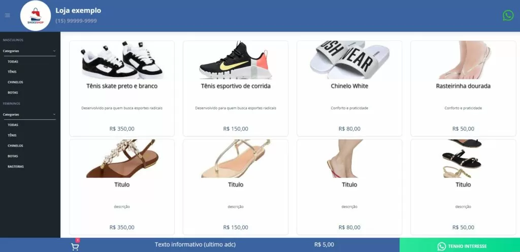 Até 4 fotos por produto, integração com whatsapp, envio de link de pagamento e muito mais... Clique e veja um exemplo.